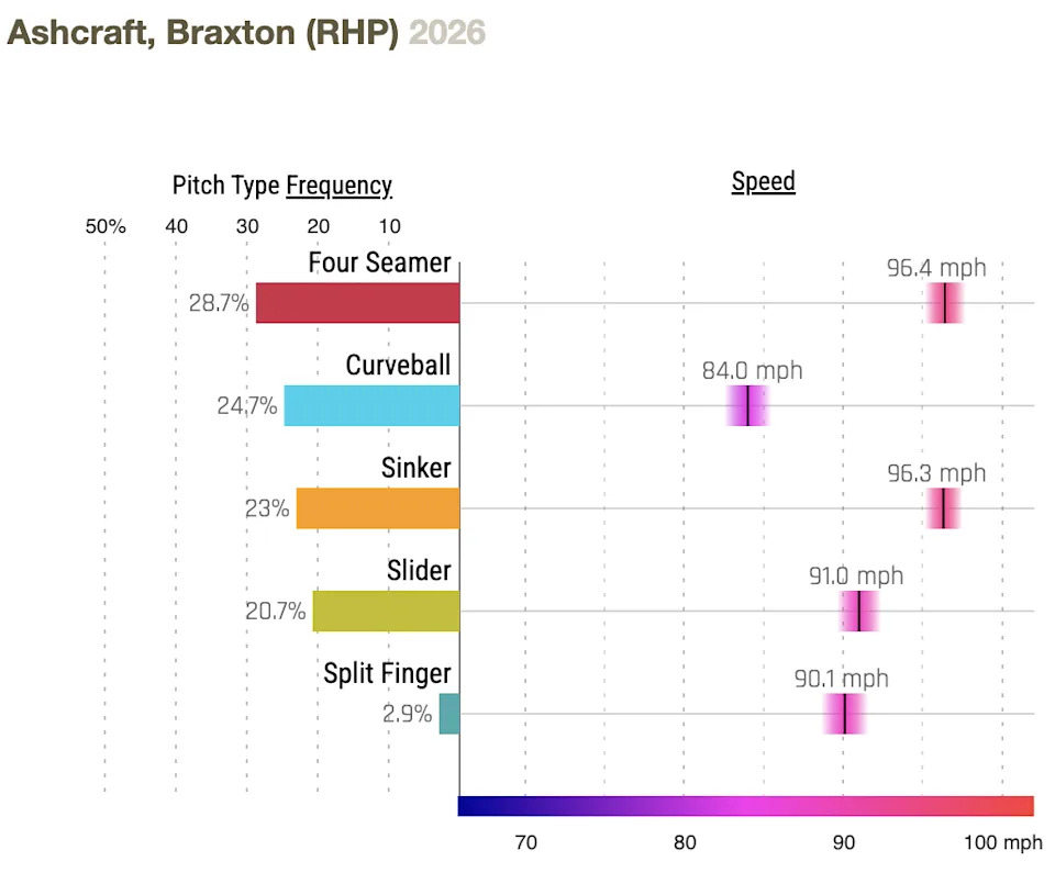 Braxton Ashcraft did pretty well in his rookie season last year — 2.71 ERA, 1.249 WHIP in 26 appearances (eight starts). This year he’s going to be a full-time member of the Pirates rotation and he has made two pretty good starts to date, completing six innings in both. In his last outing, April 5 vs. the Orioles, he struck out eight.