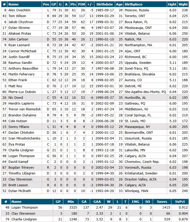 There’s a lot to like in the lineup with young players like Leonard and Sourdif taking steps forward this year and the emergence of Hutson, I. Protas and Mirshinchenko. The Caps won’t be playoff-bound this year but still have some nice young pieces starting to matriculate to the NHL.The long-term injury to Dubois, who missed 55 games this year, ended up being a season killer. Dubois put up 66 points last season and helped both special teams units, it was an absence surely missed down the middle that a young player like Hendrix Lapierre just couldn’t fill.A lotta beef on that third line that goes 6’6” 250, 6’6” 225 and 6’4” 225. Also has the rarity of two brothers playing on the same line, which is pretty cool and hasn’t happened professionally with Aliaksei being six years old than his ‘little’ brother. (Hard to call any 6’6”, 225 pound 19-year old ‘little’, isn’t it?)The Caps might have to double dip and play Thompson for a second day in a row to keep their faint playoff hopes alive.