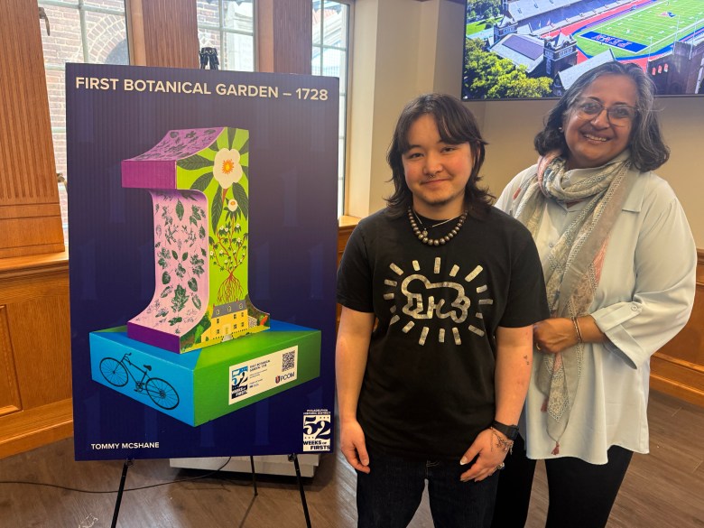 Artist Tommy McShane (left) and Bartram’s Garden Executive Director Maitreyi Roy (right) next to the botanical garden firstival statue rendition (Violet Comber-Wilen/Billy Penn)