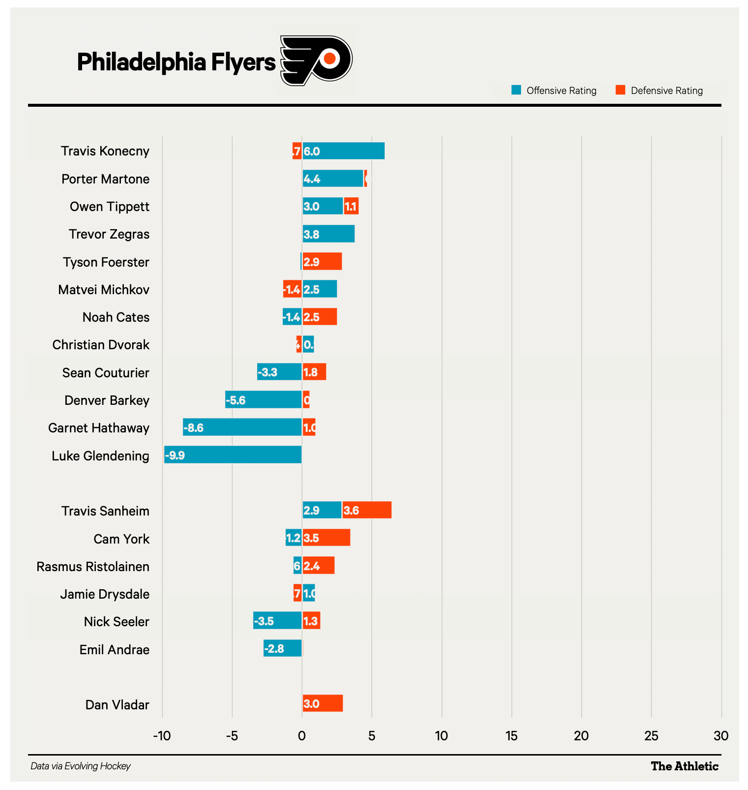 Each side of this matchup has a clear, defined strength — for Pittsburgh, it’s a plus-26 Offensive Rating, while the Flyers boast a plus-19 Defensive Rating.