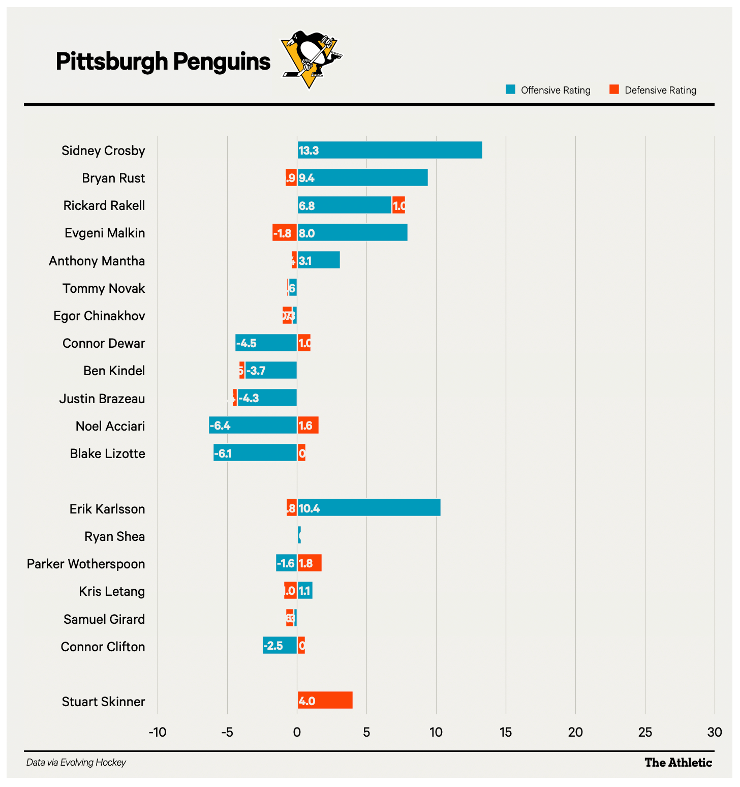 It wasn’t. Crosby has bounced back from his knee injury at the Milan Olympics, putting up positive Game Scores in nine of his last 10 games after some initial wobbliness and continuing, under Muse, to lean into his effectiveness on the forecheck/cycle game. Malkin, in terms of Net Rating, is on a similar scale with Crosby; he’s played almost entirely on the wing this season, a move that may well extend his career. Does that mean that both are primed to turn the clock back to, say, Pittsburgh’s first-round win over Philadelphia in 2009? Maybe, maybe not — and if they dominate, it’s likely to look at least a bit different. The fact that we’re having the discussion, though, is a treat.