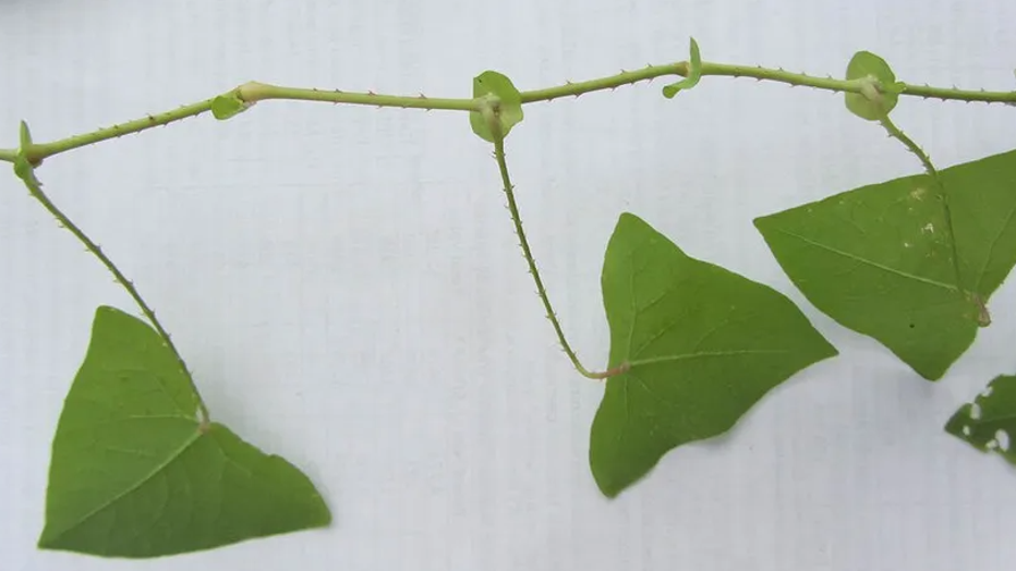 Triangular, light green leavesThin vines covered in small barbs or hooksCircular, cup-like leaves at nodes along the stemSmall white flowers and later bright blue berry-like fruits