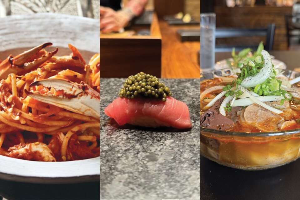 From left: Crab pasta from Palizzi Social Club; sushi from Royal Sushi & Izakaya; bún bò huế from Cafe Nhan. / Photography copyright © 2019 by Trevor Dixon. Dinner at the Club by Joey Baldino and Adam Erace, Running Press, and Kae Lani Palmisano