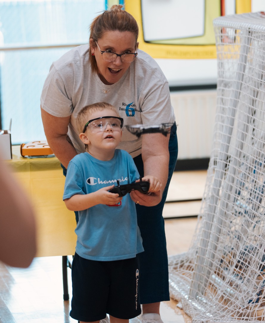 Kristen Landers showing a participant how to fly a drone at the Playground YMCA event. Submitted Photo.