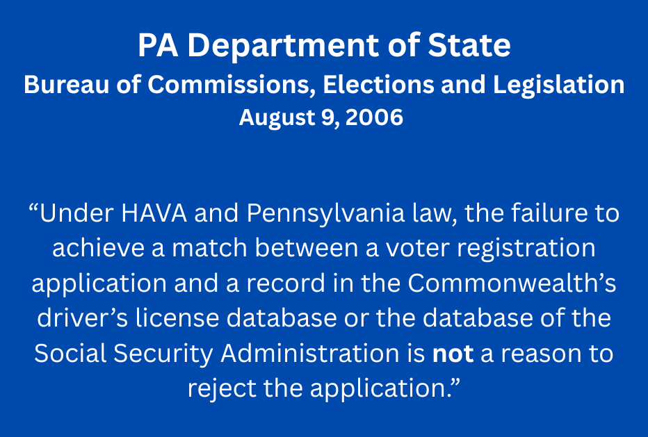 Since HAVA doesn’t require the successful match of driver’s license or social security numbers, on August 9, 2006, the Pennsylvania Department of State issued guidance telling county election offices that mismatch of identifying numbers is not a reason to reject a voter registration application.