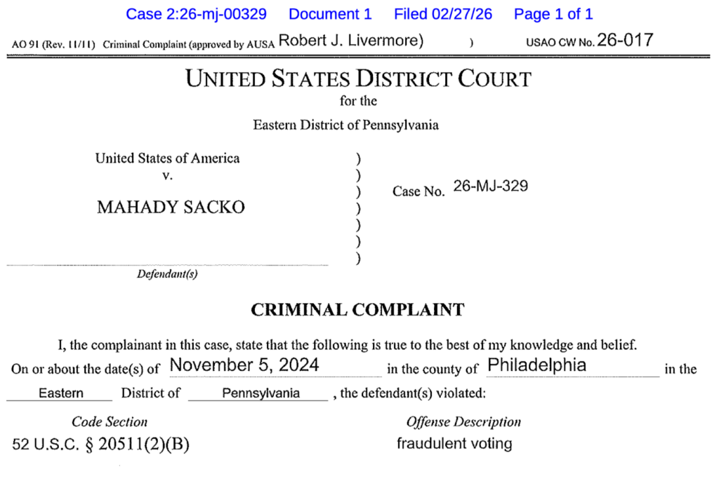On March 9, 2026 U.S. Immigration and Customs Enforcement (ICE) with the help of the Federal Bureau of Investigation (FBI) arrested Mahady Sacko, an illegal alien who was ordered deported by an Appeals Court in 2002. While living in Philadelphia, Mr. Sacko registered to vote on August 24, 2006 using a paper registration form where he claimed to be a U.S. citizen. According to FBI Special Agent Mickel McGann’s Affidavit, between August 24, 2006 and August 1, 2024, Mr. Sacko registered to vote a total of 12 times using paper forms, online registration, and PennDOT. Each time he claimed to be a U.S. citizen by checking a box. Voter records show that he voted in the 2008, 2012, 2016, and 2020 general elections as well as the 2016 and 2020 primaries.