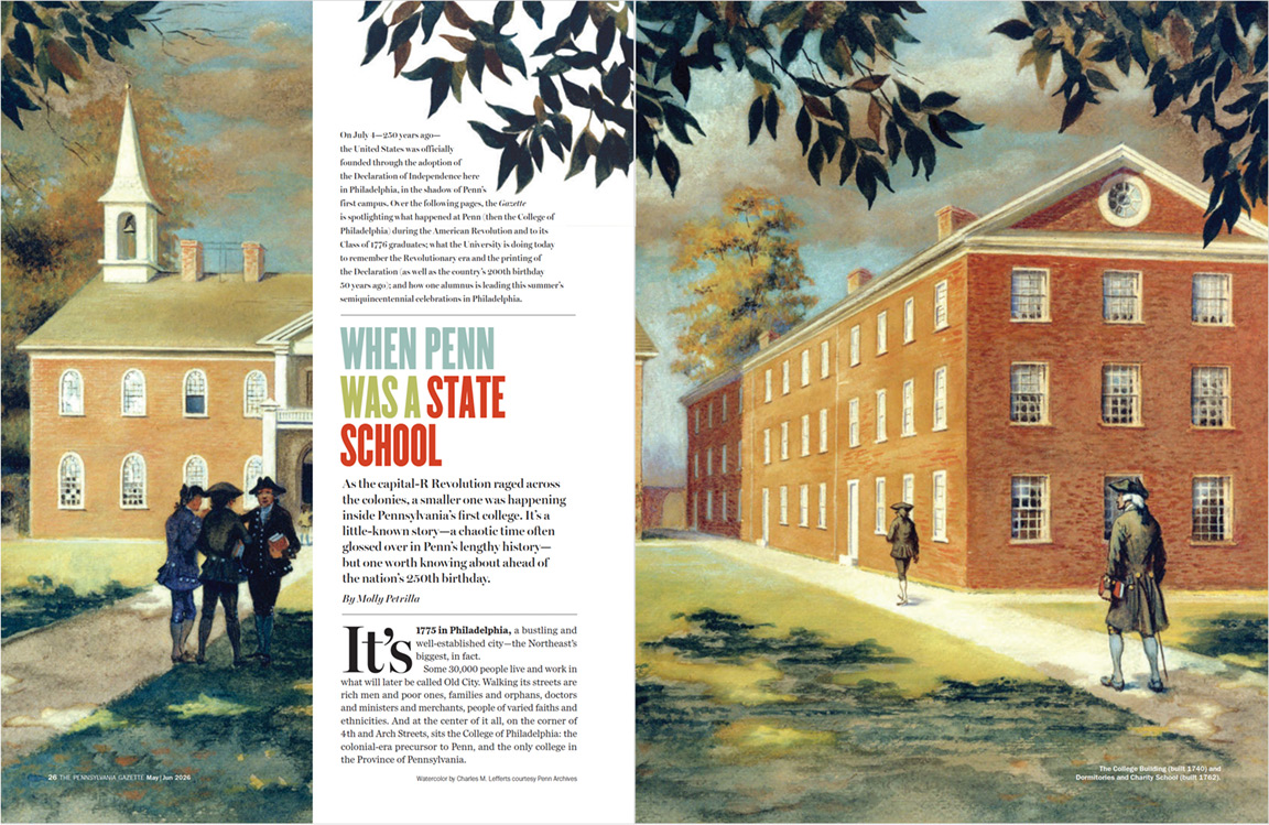 On July 4—250 years ago—the United States was officially founded through the adoption of the Declaration of Independence here in Philadelphia, in the shadow of Penn’s first campus. Over the following pages, the Gazette is spotlighting what happened at Penn (then the College of Philadelphia) during the American Revolution and to its Class of 1776 graduates; what the University is doing today to remember the Revolutionary era and the printing of the Declaration (as well as the country’s 200th birthday 50 years ago); and how one alumnus is leading this summer’s semiquincentennial celebrations in Philadelphia.