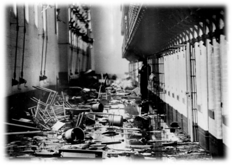 During riots, inmates would throw furniture from the upper levels of Western Pen, smashing it on the first floor. This photo was taken after one such riot in 1953. Photo courtesy of Doug MacGregor.