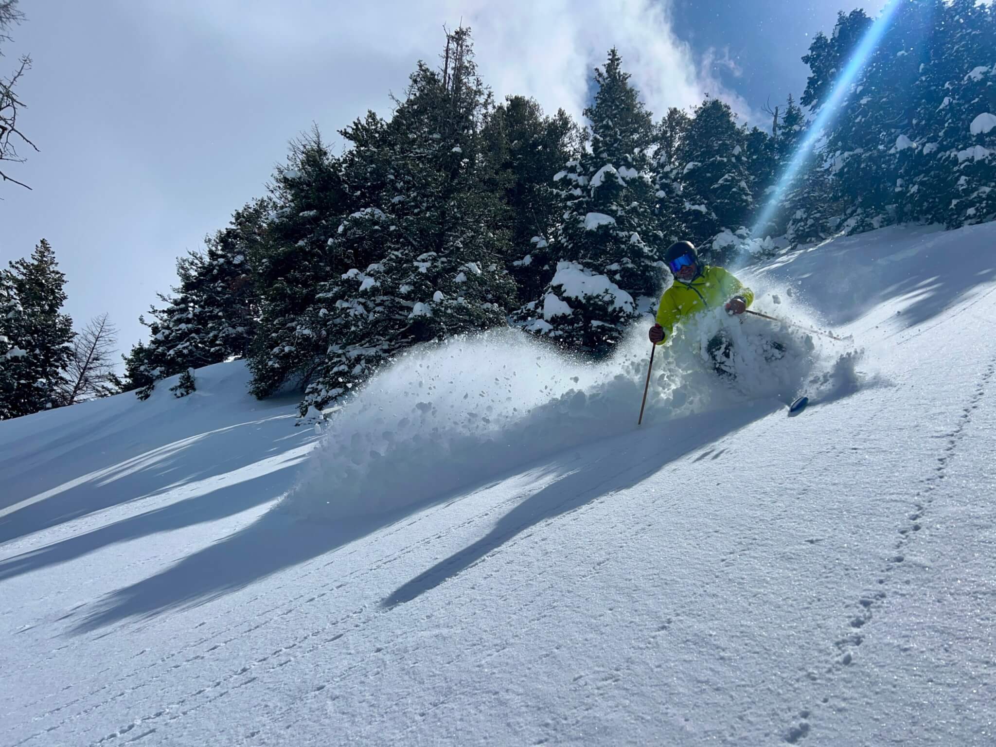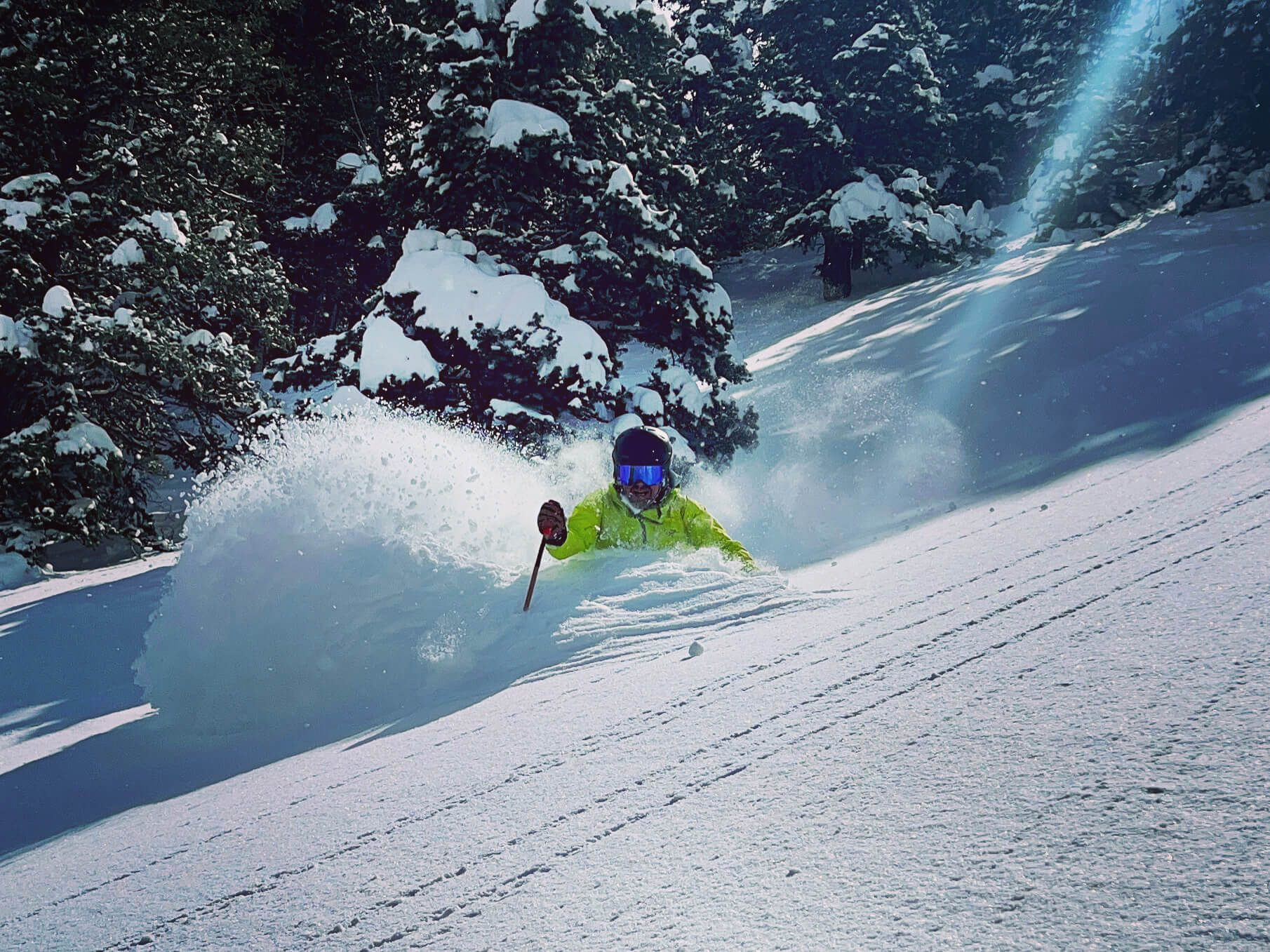Mike Ruzek carving through fresh powder, doing what he loves most — chasing storms across the Wasatch. Photo: Mike Ruzek