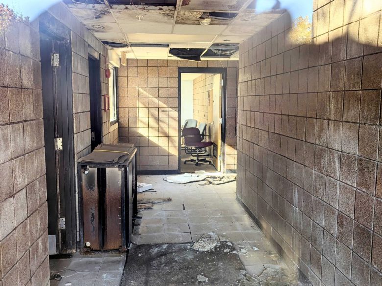 The interior of a modern portion of Western Pen seen through a glass door. This portion of the building was built throughout the 1970s and 1980s, and was abandoned in 2017. Photo by Roman Hladio.
