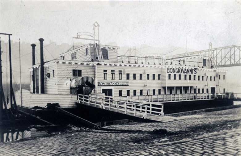 Starting during Prohibition, Pittsburgh entertainment and hospitality entrepreneurs used showboats as a model to open floating casinos, speakeasies and nightclubs. In 1923, Downtown restaurant owner Frank Bongiovanni opened his Floating Palace on the Mon Wharf. Built by the John Eichleay Jr. company in Hays, Bongiovanni’s boat had a colorful history, especially after later operators renamed it the Show Boat in 1929. A raid by federal agents the following year made headlines for months and became a Pittsburgh organized crime legend.