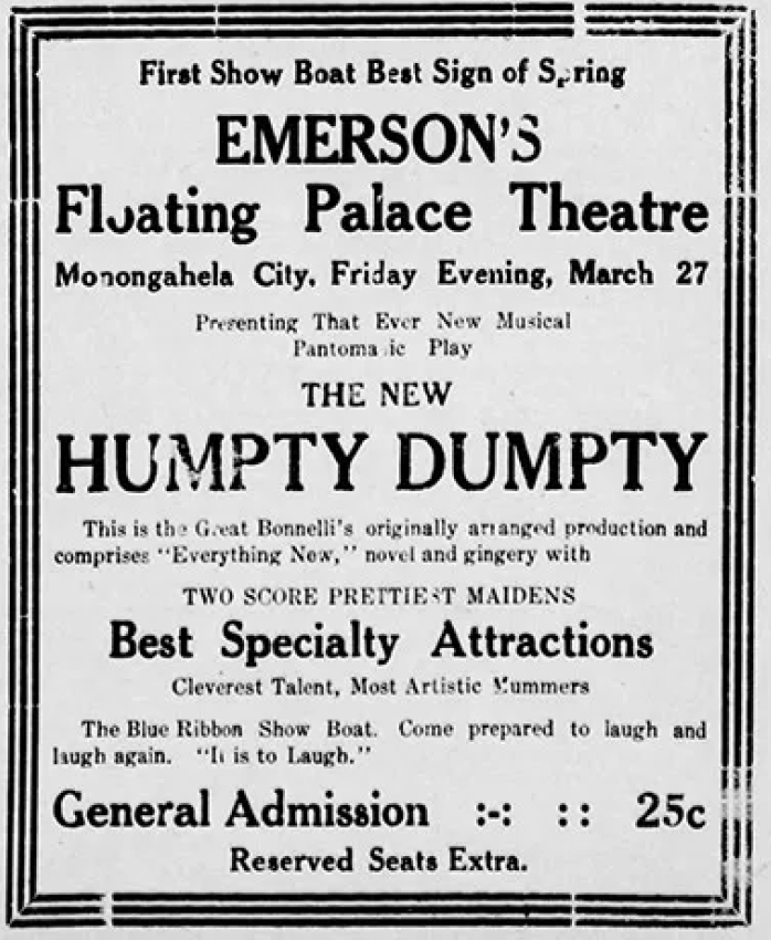 Ad for Emerson’s Floating Palace published in the Monongahela, Pennsylvania, Daily Republican March 26, 1908. Via Newspapers.com.