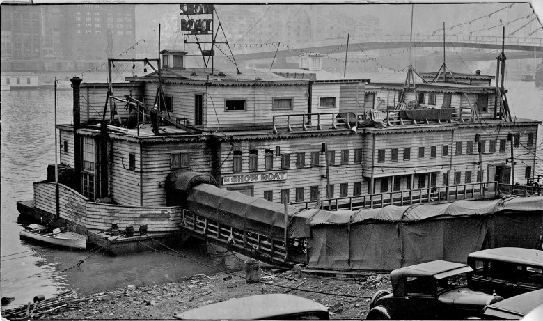 In 1831, William Chapman’s Floating Theater cast off from Pittsburgh and floated down the Ohio River. The Floating Theater was the first purpose-built showboat. By the turn of the 20th century, Pittsburgh boatyards and river men had built dozens of showboats. Harbors along the Monongahela and Ohio rivers became destinations and home bases for them.
