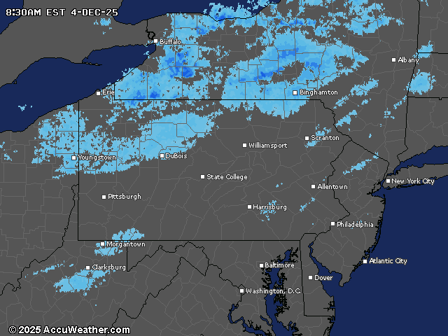A few snow showers are possible along and north of Interstate 80 during the day Thursday, with a slight chance of snow squalls in the far northern parts of the area. While accumulation is not expected to be significant, travelers should be prepared for sudden, brief periods of reduced visibility and potentially slick road conditions.