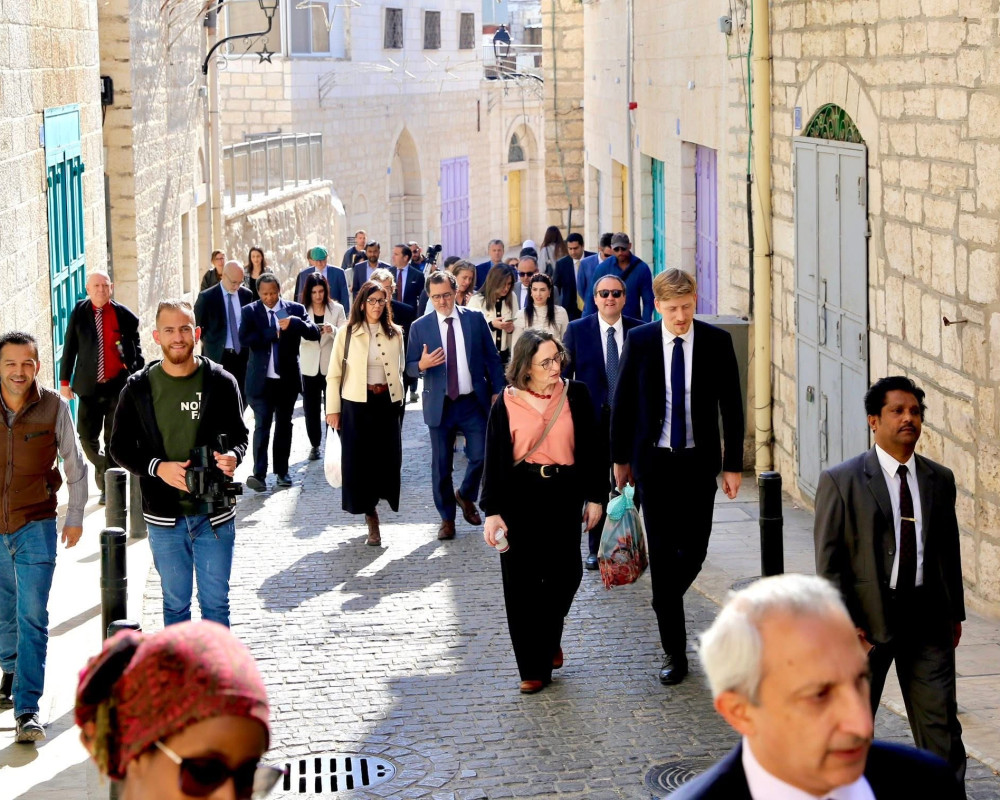 The Palestinian Ministry of Tourism and Antiquities organised a tour on Tuesday in Bethlehem for members of the diplomatic corps accredited to the State of Palestine, aiming to brief them on conditions in the governorate amid Israeli occupation measures and on Palestinian efforts to revive and develop the tourism sector as a key tool for promoting Palestinian culture and strengthening the local economy in Bethlehem and across Palestine.