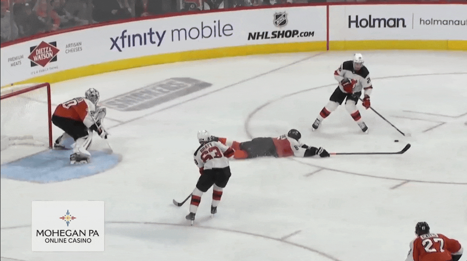 Vladar began this two-on-one rush at the top of his crease, but once Devils forward Timo Meier reached the faceoff dot, he retreated toward his goalline. It’s a case of Vladar maximizing his size. He knows once Meier gets that close to him, his 6-5 frame covers most of the net anyway, so the additional depth isn’t as necessary. By backing up, Vladar reduces the distance he needs to travel to reach his far-side post in the event of a pass, which is exactly what happened.