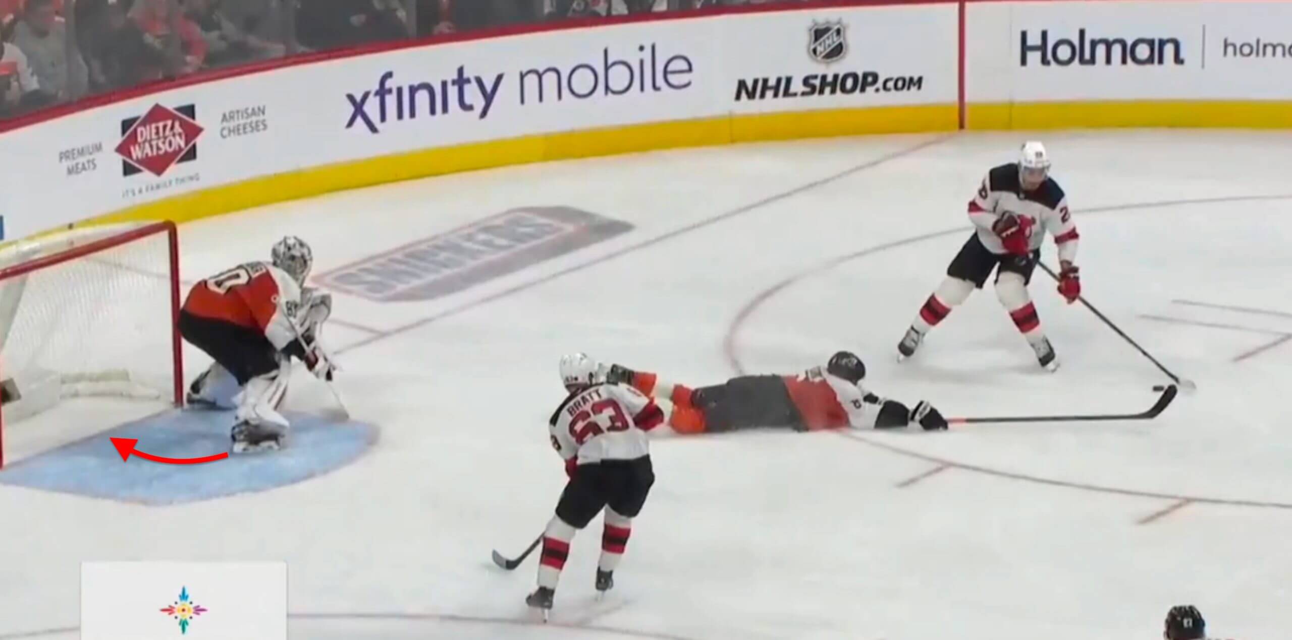 Now, back to the save against the Devils on Nov. 22. At this point, Vladar still had to remain square to the puck to respect the shot threat, but the moment he read Meier was passing it across to Jesper Bratt (No. 63) on the backdoor, he rotated his right skate back to the goal line to flatten out and prepare for a lateral slide.