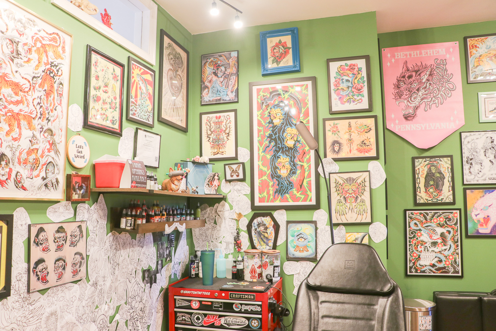 The hum of tattoo machines and chatter fills the vibrant space of Double Dare Tattoo, where every inch of the walls is covered with art.