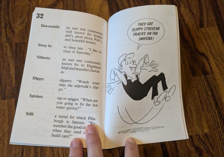 I thought of this while leafing through Sam McCool’s New Pittsburghese: How to Speak Like a Pittsburgher. Published by Goodwill Industries in 1982, the booklet uses a dictionary-like approach to cover the ins and ahts of yinzer speak.