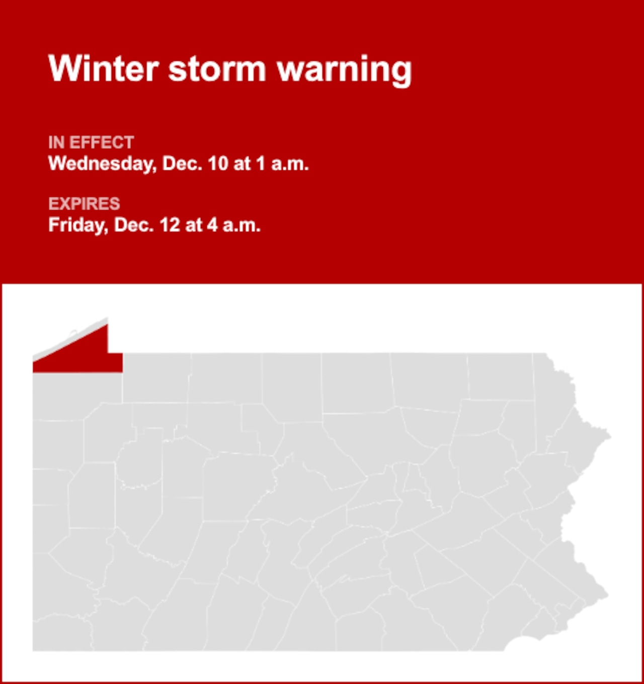 On Wednesday at 12:45 a.m. a winter storm warning was released by the National Weather Service valid from 1 a.m. until Friday 4 a.m. for Southern Erie.