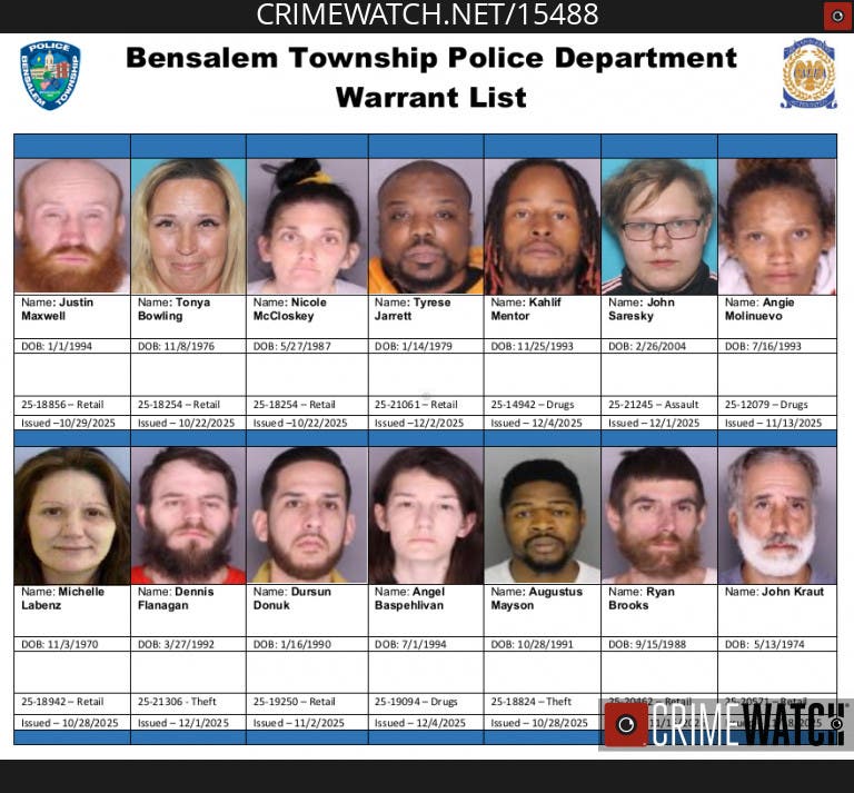 The list is a community notification of active warrants from the Bensalem Township Police Department. The list is updated weekly.