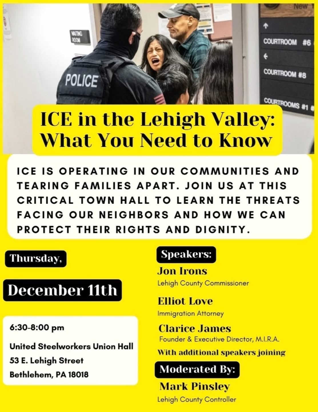 “Join us for this critical town hall to hear firsthand stories, understand the immigration system and learn how to protect yourself and families in the Lehigh Valley,” Pinsley said. “All are welcome.”