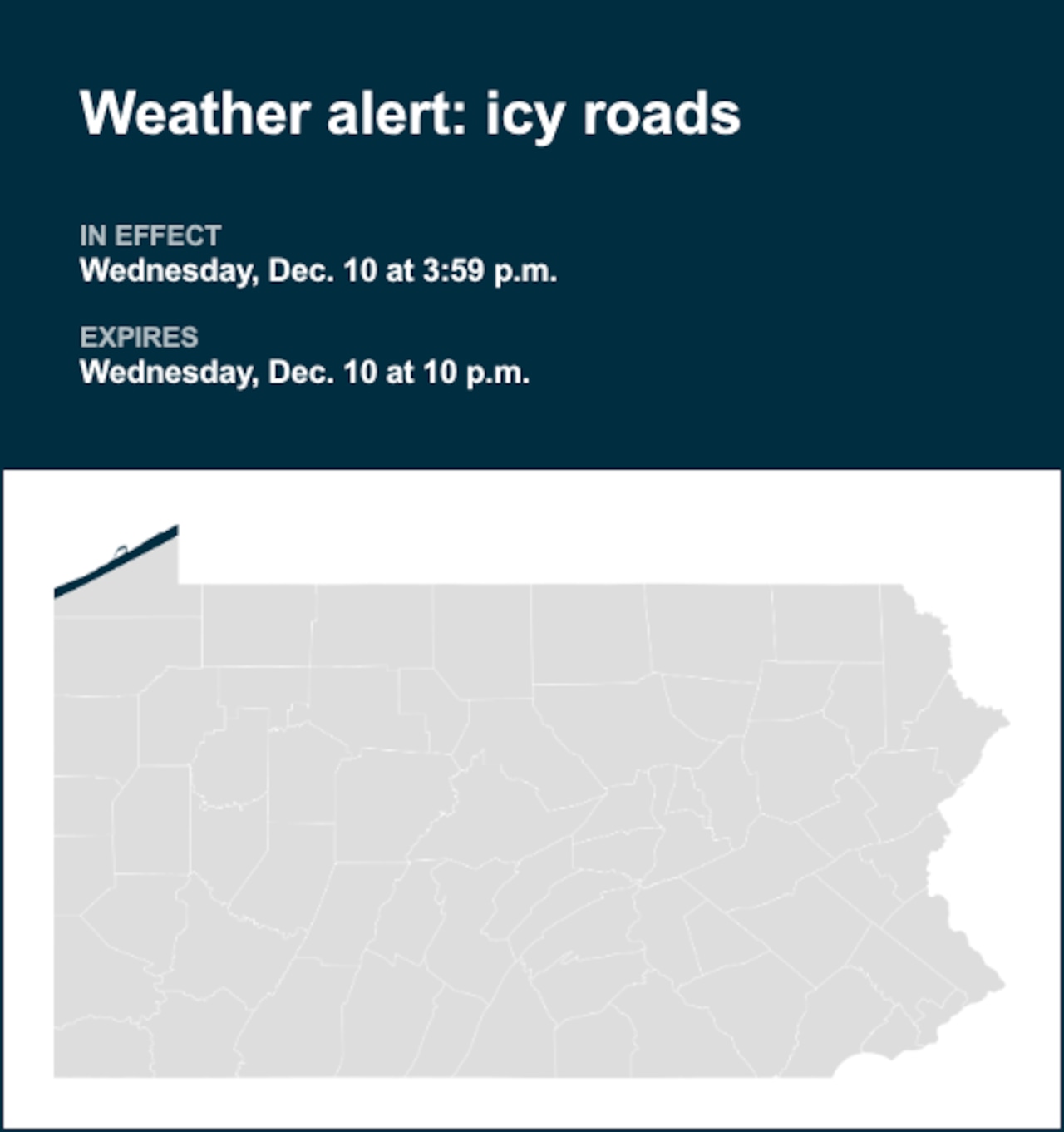The National Weather Service issued a report at 3:59 p.m. on Wednesday for icy roads until 10 p.m. for Northern Erie.