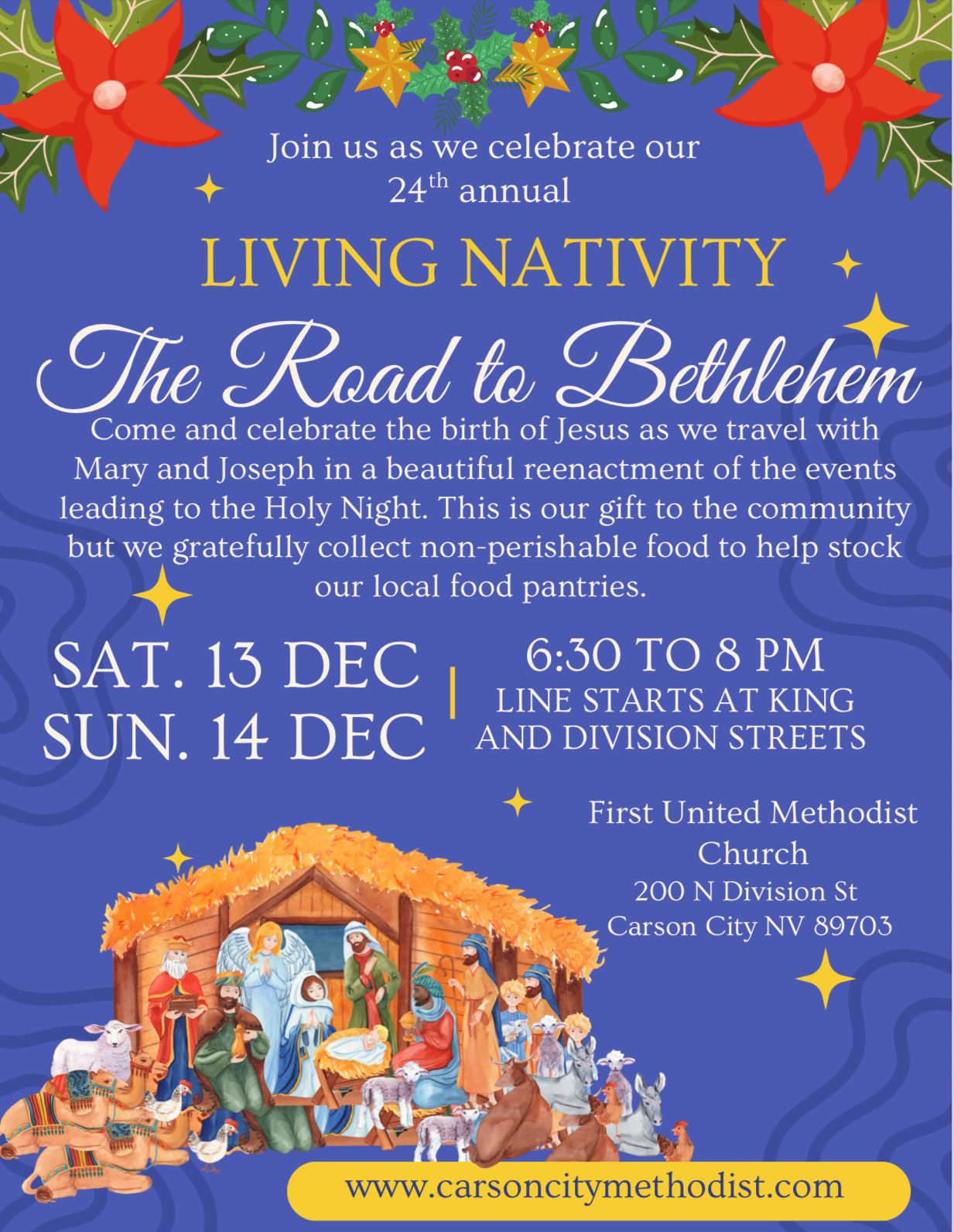 Bring the family and join First United Methodist Church in Carson City this weekend as we reenact the story of Jesus’s birth.Â