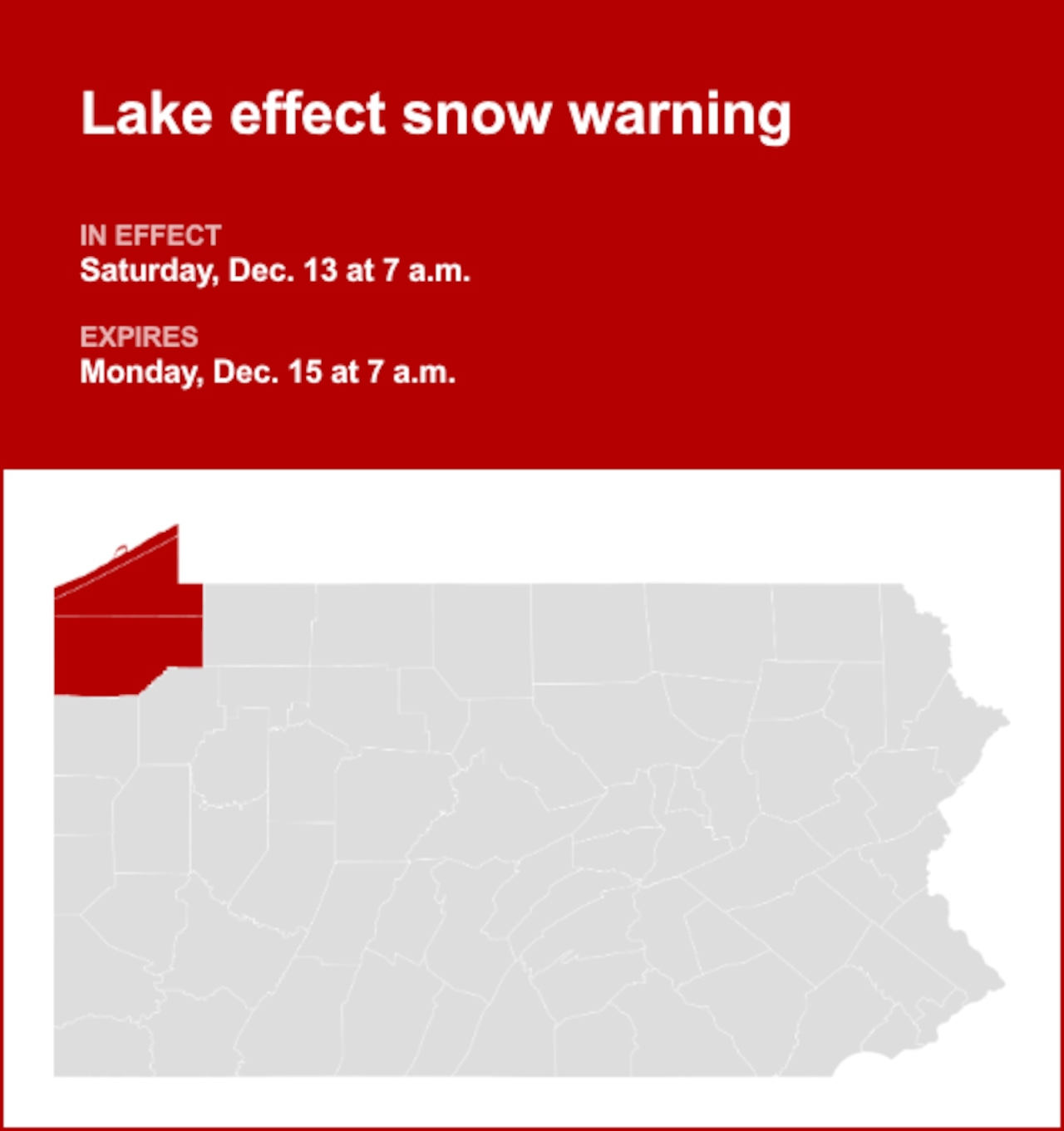 A lake effect snow warning was issued by the National Weather Service on Friday at 1:14 p.m. valid from Saturday 7 a.m. until Monday 7 a.m. for Northern Erie and Southern Erie as well as Crawford County.