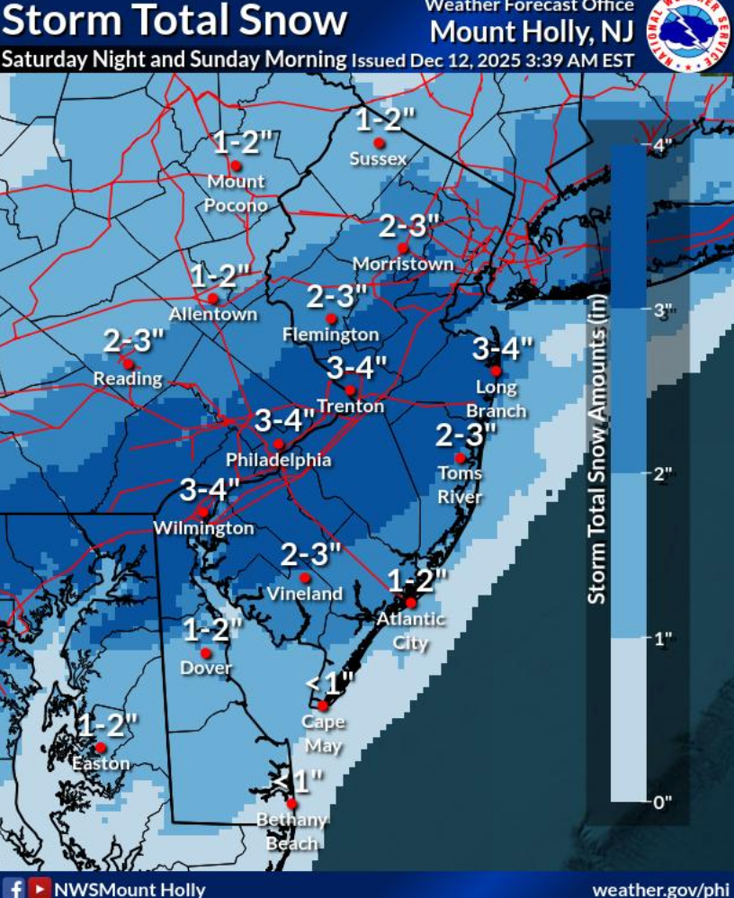The winter storm heading toward the Delaware Valley is likely to bring around 3 to 4 inches of accumulating snow on Saturday night into early Sunday, according to the National Weather Service.