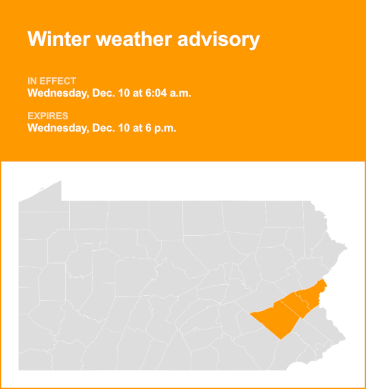 The National Weather Service released an updated winter weather advisory at 6:04 a.m. on Wednesday in effect until 6 p.m. for Berks, Lehigh and Northampton counties.