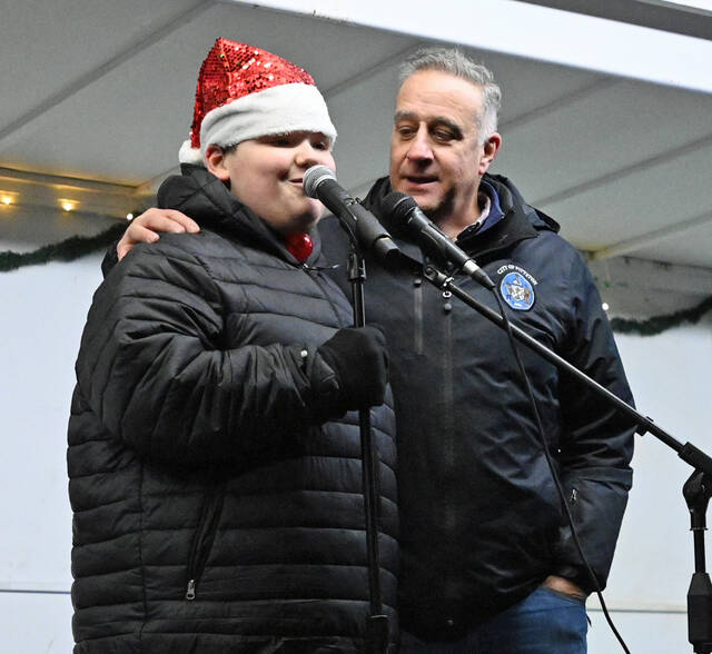 Eleven-year-old Jaxson Smith, along with City of Pittston Mayor Michael Lombardo, count down to turn on the official Christmas tree lights during La Festa Di Natale.