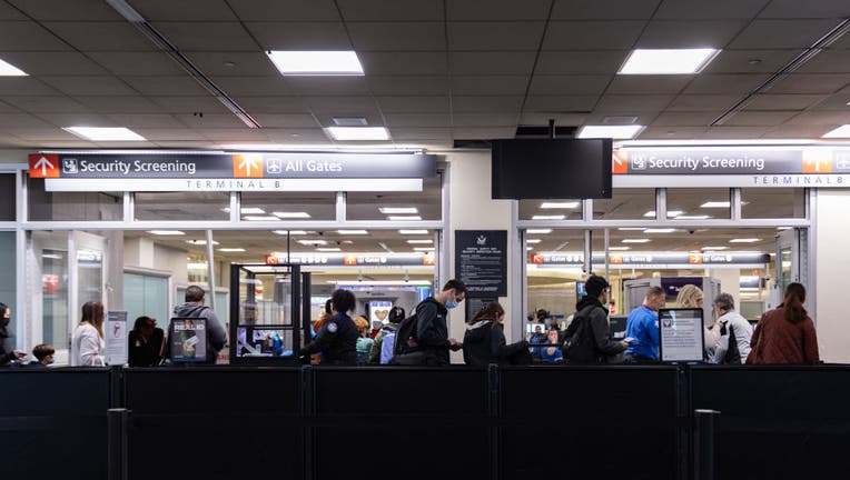 Travelers wait in line at a security checkpoint at Philadelphia International Airport (PHL) in Philadelphia, Pennsylvania, US, on Friday, Dec. 23, 2022. An estimated 112.7 million people will travel 50 miles or more from Dec. 23 to Jan. 2, up by 3.6