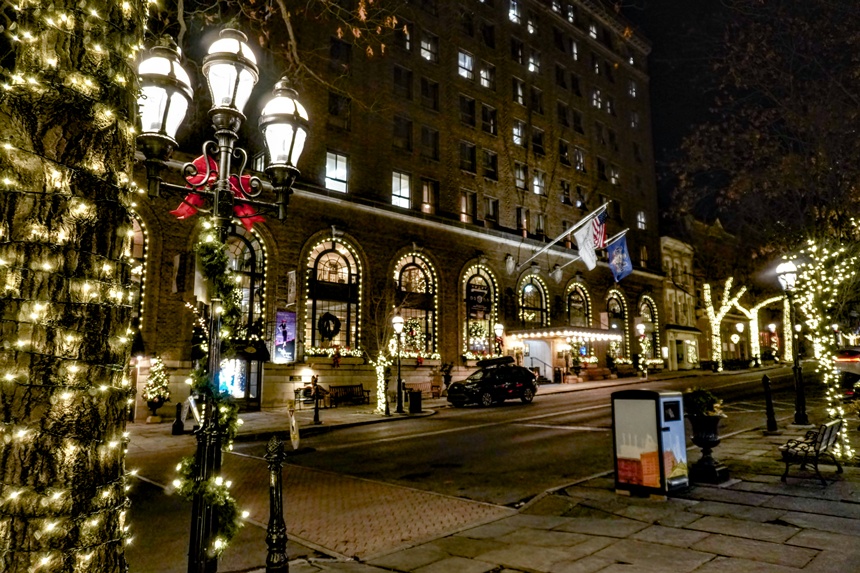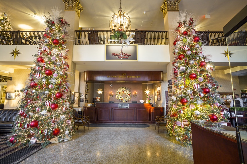I head up the steps of the Historic Hotel Bethlehem, anchoring the south end of Main Street, and stomp the snow off my feet before venturing into the two-story lobby, dominated by a pair of 20-foot-high Christmas trees and, set on a ledge above the doorway, a near-life-size Nativity scene.