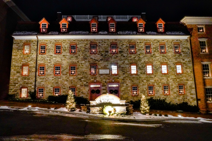At the lower end of Main Street sits the huge “Single Brethren’s House,” at one time among the largest non-church buildings in America. For the Christmas season, each of its 38 street-facing windows is illuminated with a single candle. Standing on the sidewalk, it is easy to imagine young 18th century men at each of those windows, holding one of those candles, gazing longingly in the direction of the single sisters’ quarters.