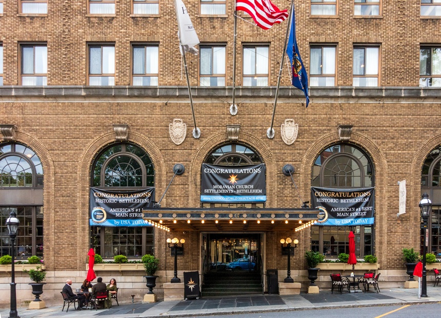 Banners hung from the Historic Hotel Bethlehem announce the designation of the Moravian Church Settlement as a UNESCO World Heritage Site and Bethlehem as America’s #1 Best Main Street according to USA Today (Shutterstock)