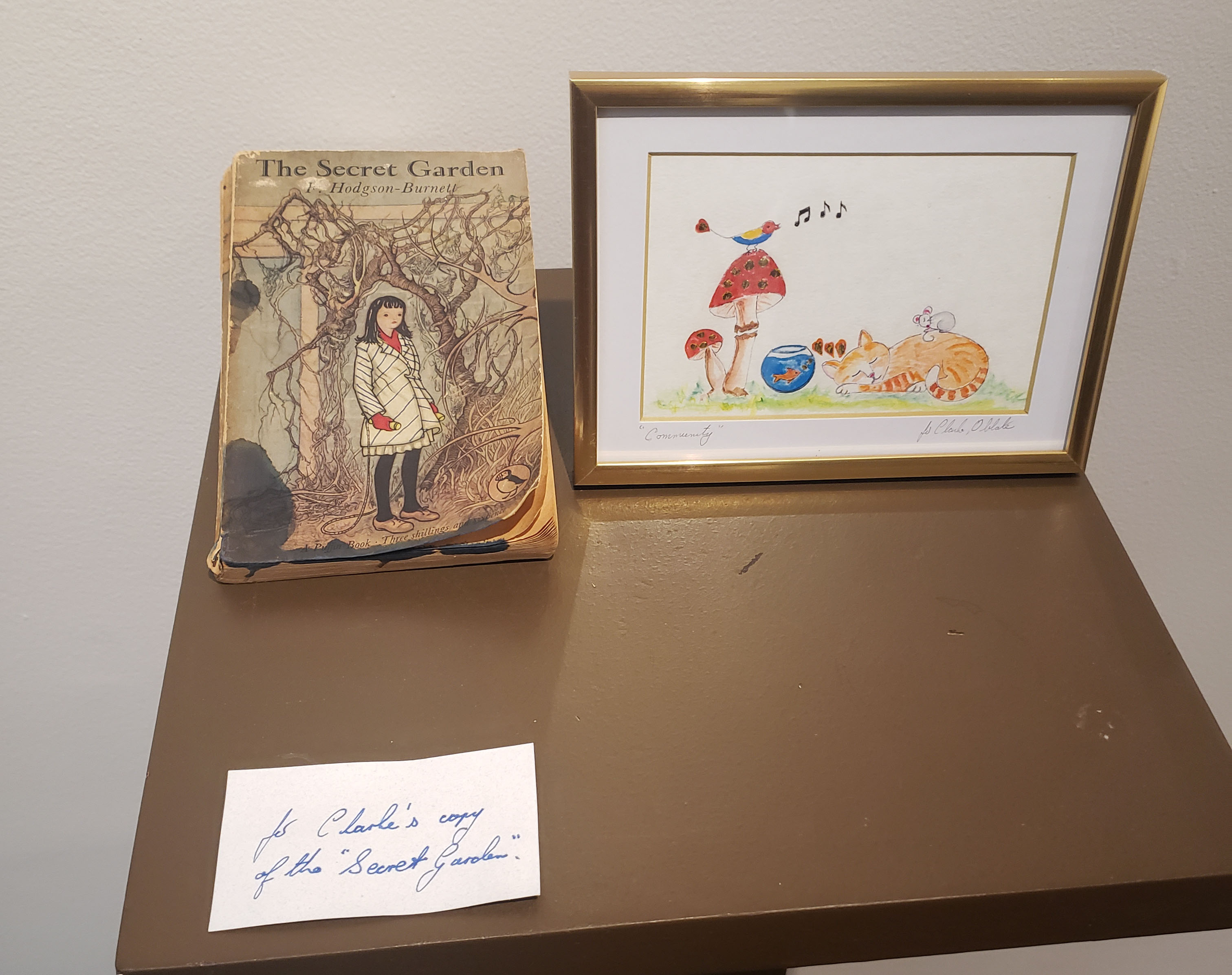 One piece of her art, featuring a tweeting bird, a curled-up cat, a sleepy mouse, a goldfish in a bowl, and two tilted mushrooms, is displayed on a table with a well-worn copy of her favorite book, The Secret Garden, a gift to Clarke from aunts in her native England. These days, Clarke finds a feminist message in the beloved children’s story.