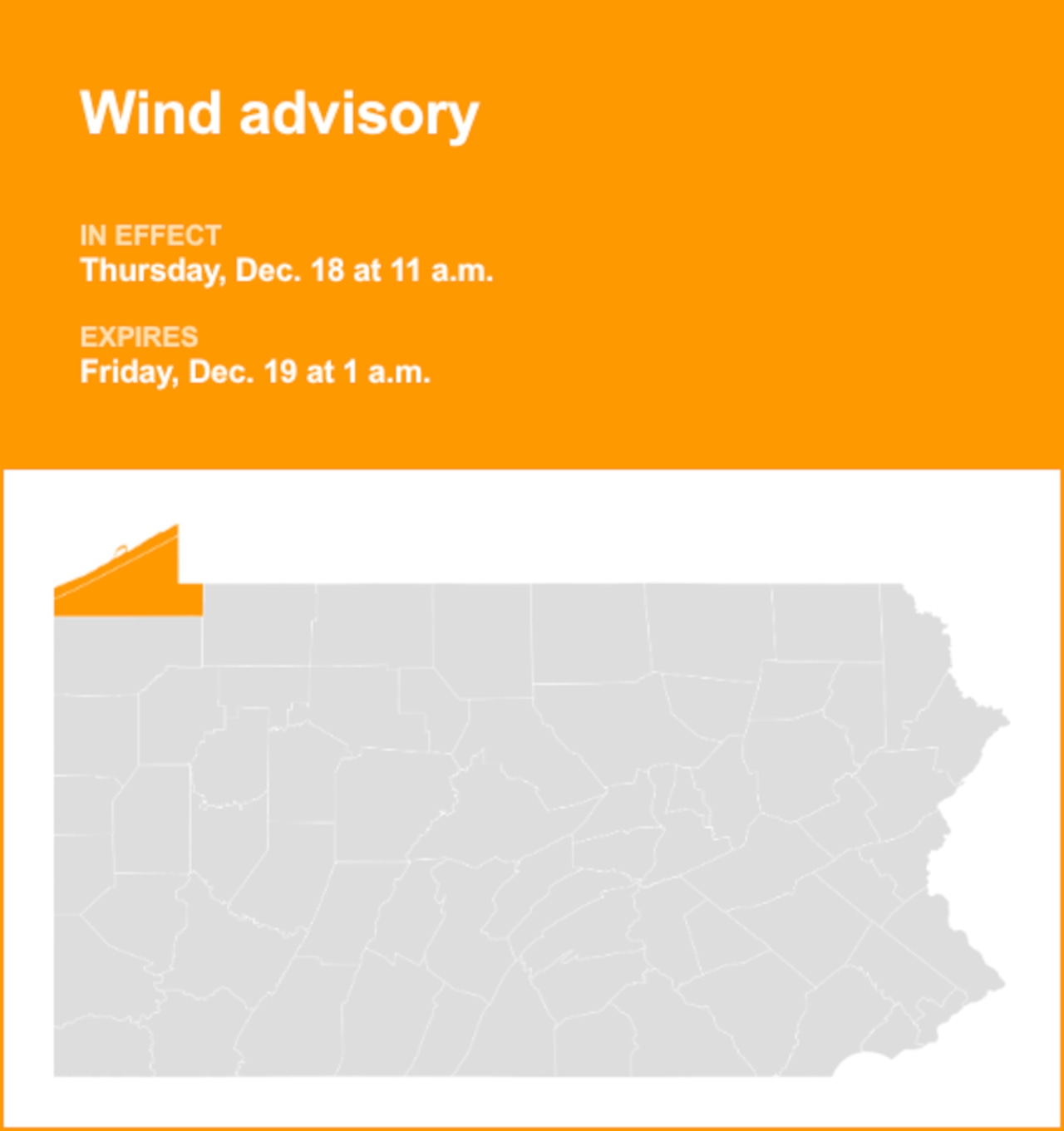 A wind advisory was issued by the National Weather Service on Wednesday at 12:26 p.m. valid from Thursday 11 a.m. until Friday 1 a.m. for Northern Erie and Southern Erie.