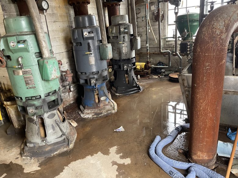 Persistent unrepaired leaks have left standing water in a room at the Vicinity Energy steam plant where workers operate electrical breakers, creating a safety hazard. (Courtesy of IBEW Local 614)