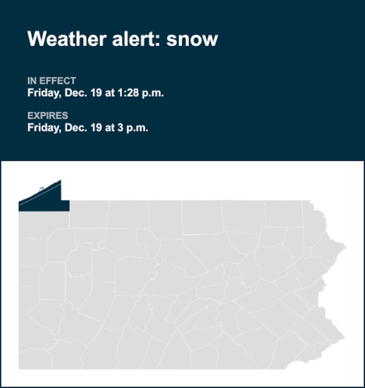 The National Weather Service issued a report at 1:28 p.m. on Friday for snow until 3 p.m. for Northern Erie and Southern Erie.