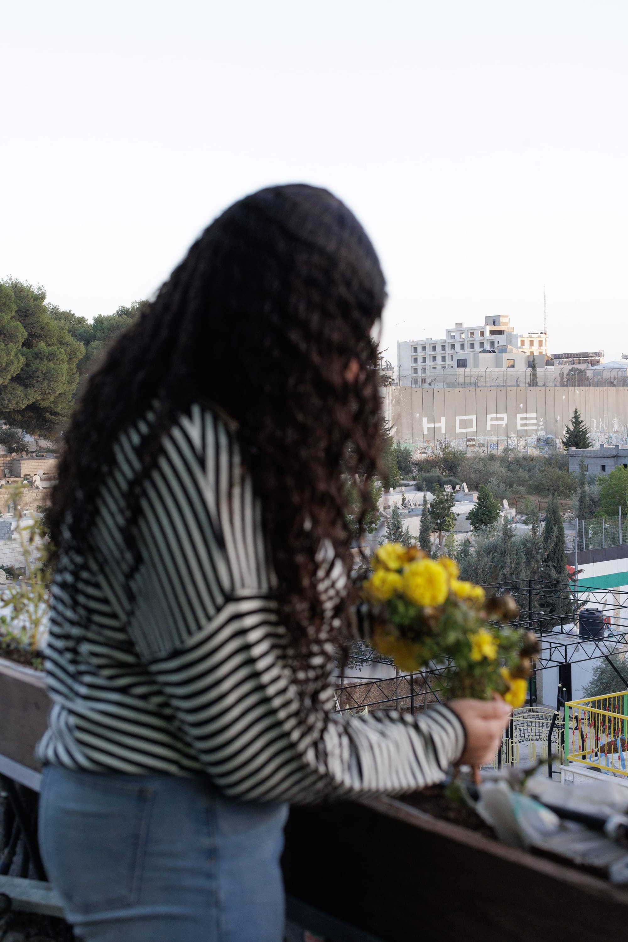 She cannot see the prison where her father is, hundreds of miles away in Israel. But on the barrier wall she can pick out one word – hope, it says in letters large enough to read from afar.