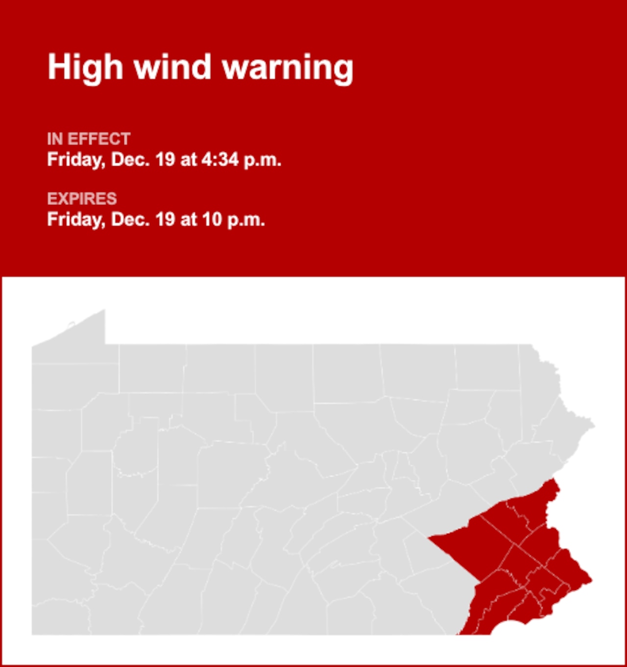 The National Weather Service released a high wind warning at 4:34 p.m. on Friday in effect until 10 p.m. for Western Chester, Eastern Chester, Western Montgomery and Eastern Montgomery as well as Berks, Lehigh, Northampton, Delaware, Philadelphia and Bucks counties.