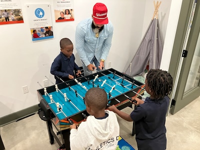 Justin Agard plays foosball with three kids he mentors through Friends of the Children Philadelphia. (Carly Sitrin / Chalkbeat)