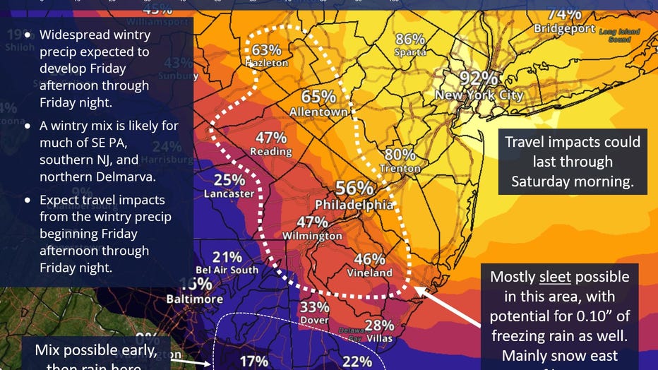 While forecasters predict that Philadelphia and the surrounding counties will see mostly sleet, Philly has a 56% chance to see more than two inches of precipitation by 7 a.m. Saturday, with that number going up further north.