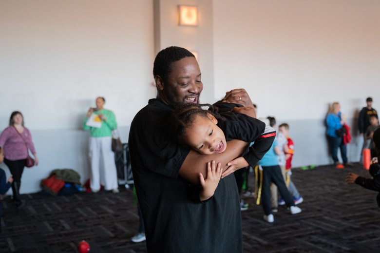 Quintin Jones picks up his son Josiah while playing flag football during the NFL Play 60 training camp at the Heinz History Center on Feb. 1, 2025.
