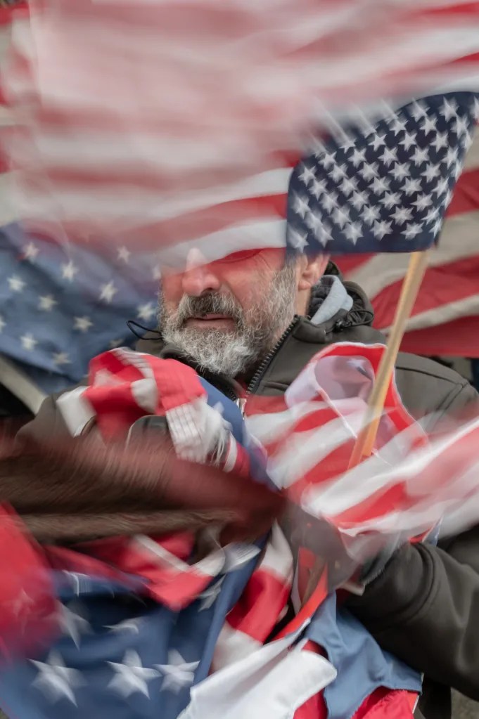 Mark Saab holds upside down American flags during a 50501 protest downtown on Feb. 17, 2025.