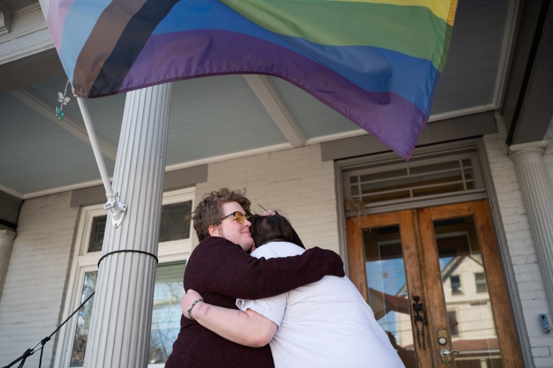 Cori Fraser hugs their kid, Salem at home on March 27, 2025.