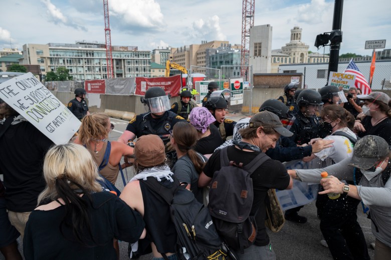 Pittsburgh Police officers clash with protesters while using pepper spray outside of the Pennsylvania Energy and Innovation Summit in which President Trump was attending at Carnegie Mellon University on July 15, 2025.
