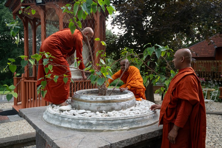 Bhante Kamalasiri, Bhante Metta and Bhante Pemaratana adjust a Bodhi tree, a sacred fig tree in Buddhism at the Pittsburgh Buddhist Center on July 16, 2025.