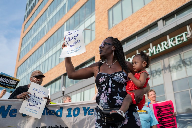 Crystal Jennings-Rivera marches in front of the Whole Foods Market which was built after Penn Plaza residents were served eviction notices 10 years ago.